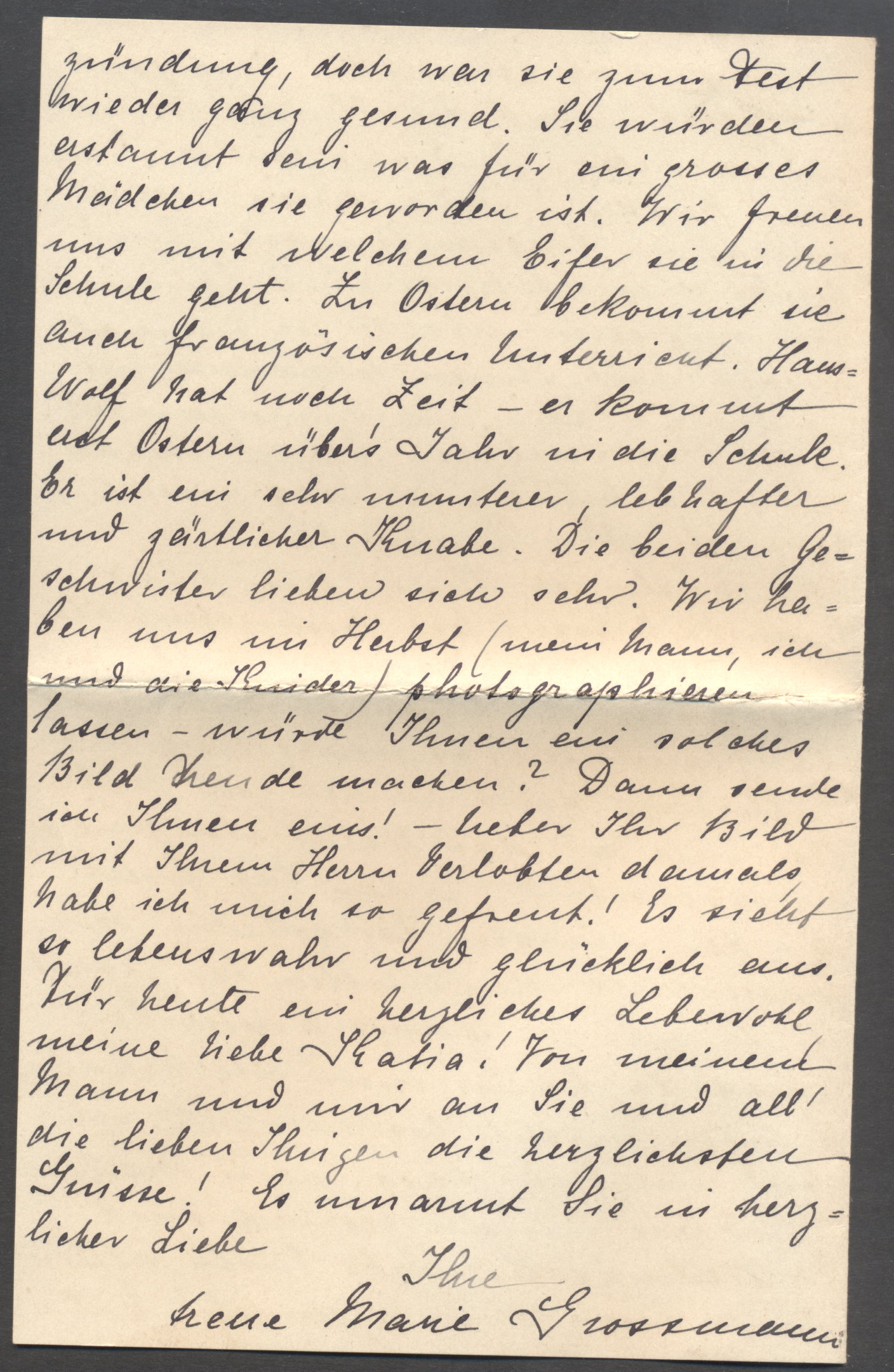 zündung, doch war sie zum Fest wieder ganz gesund. Sie würden erstaunt sein was für ein grosses Mädchen sie geworden ist. Wir freuen uns mit welchen Eifer sie in die Schule geht. Zu Ostern bekommt Sie auch französisch Unterreicht. Hans-Wolf hat noch Zeit - er kommt auch Ostern über's Jahr in die Schule. Er ist ein sehr munterer, lebhafter und zärtlicher Knabe. Die beiden Geschwister lieben sich sehr. Wir haben uns im Herbst (mein Mann, ich und die Kinder) photographieren lassen - würde Ihnen ein solches Bild Freude machen? Dann sende ich Ihnen eins! Ueber Ihr Bild mit Ihrem Herrn Verlobten damals habe ich mich so gefreut! Es sieht so lebenswahr und glücklich aus. Für heute ein herzliches Lebewohl meine liebe Katia! Von meinem Mann und mir an Sie und all' die lieben Ihrigen die herzlichsten Grüsse! Es umarmt Sie in herzlicher Liebe