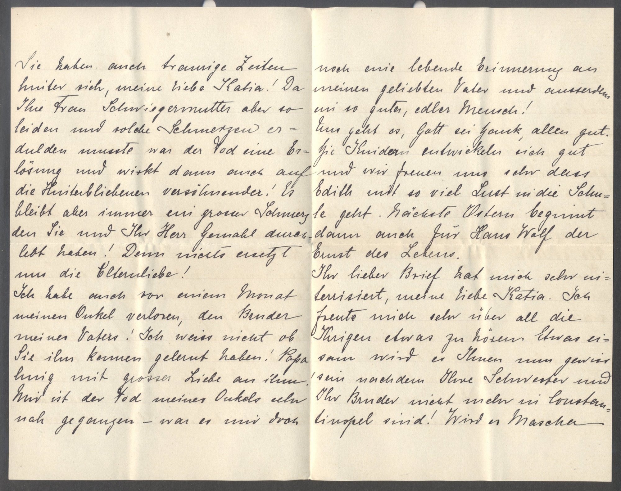 Ihr lieber Brief hat mich interessiert, meine liebe Katia. Ich freute mich sehr über all die Ihrigen etwas zu hören. Etwas einsam wird es Ihnen nun gewiss sein nachdem Ihre Schwester und Ihr Bruder nicht mehr in Constantinopel sind! Wird es Mascha