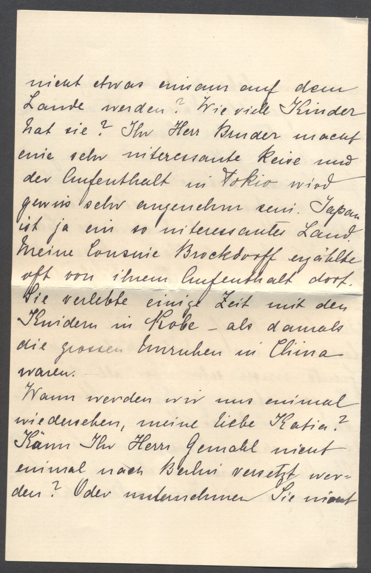 nicht etwas einsam auf dem Lande werden? Wie viele Kinder hat sie? Ihr Herr Bruder macht eine sehr interessante Reise und der Aufenthalt in Tokio wird gewiss sehr angenehm sein. Japan ist ja ein so interessantes Land. Meine Cousine Brockdorff erzählte oft von ihrem Aufenthalt dort. Sie verlebte einige Zeit mit den Kindern in Kobe - als damals die grossen Unruhen in China waren.