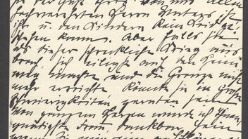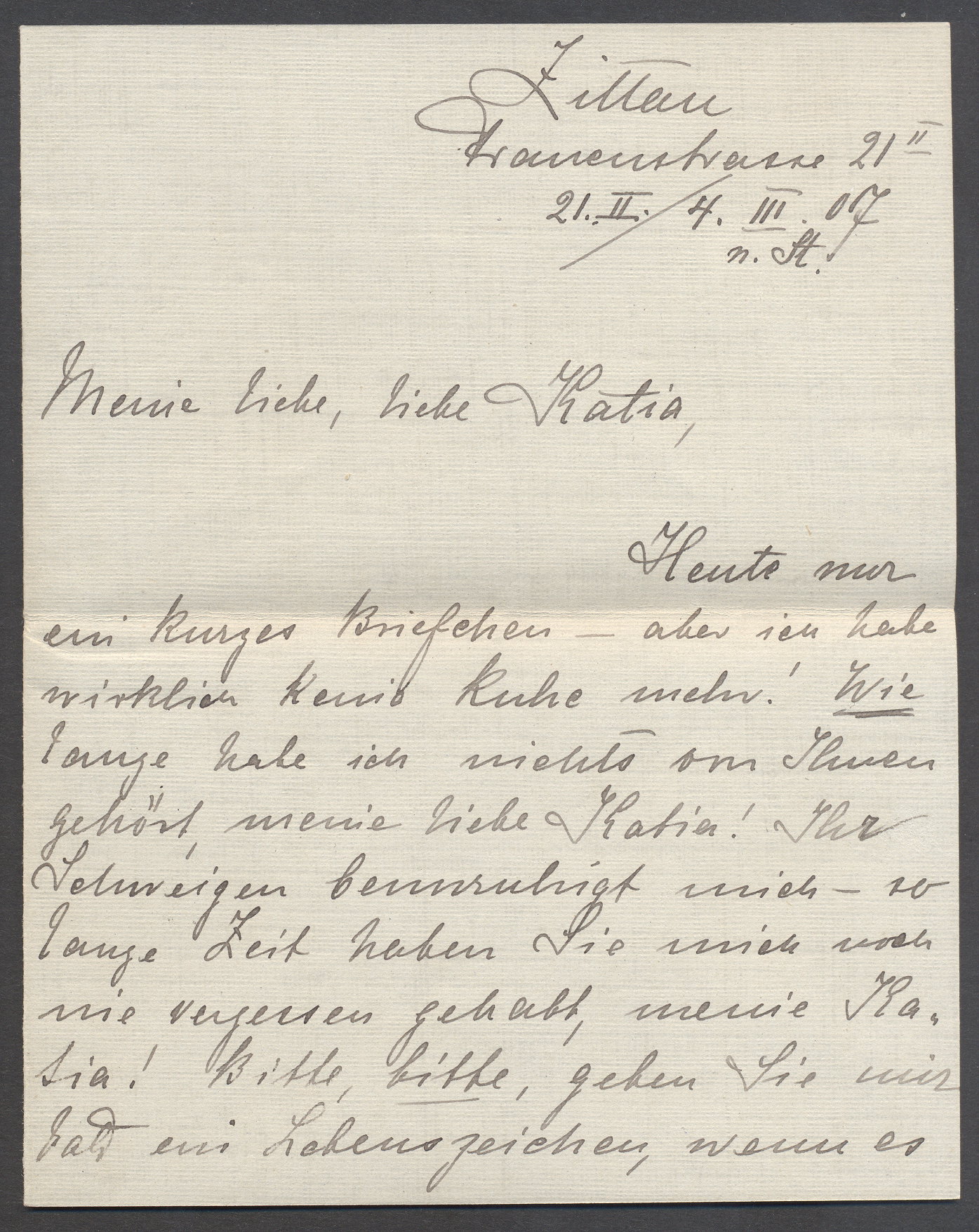 Heute nur ein kurzes Briefchen - aber ich habe wirklich keine Ruhe mehr! Wie lange habe ich nichts von Ihnen gehört meine Liebe Katia! Ihr Schweigen beunruhight mich - so lange Zeit haben Sie mich noch nie vergessen gehabt, meine Katia! Bite, bitte, geben Sie mir ein Lebenszeichen, wenn es