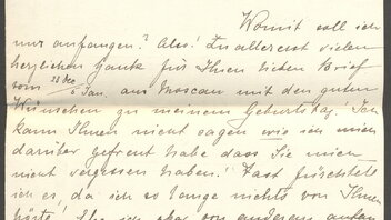 Womit soll ich nur anfangen? Also! Zu allererst vielen herzlichen Dank für Ihren lieben Brief vom 23 Dec/5 Jan aus Moscau mit den guten Wünschen zu meinem Geburtstag! Ich kann Ihnen nicht sagen wie ich mich darüber gefreut habe dass Sie mich nicht vergessen haben!