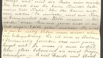 geliebten Vater! Möchte er so werden wie der teure Verklärte war - dies ist mein innigstes Gebet. -Ja, zum Herbst ist er 7 Jahre geworden. Jetzt wächst er sehr und wird ein richtig wilder Junge. Er geht sehr gern in die Schule - vorläufig ist es auch mehr Spielerei! Zu ostern, wenn er versetzt wird, wird die Sache schon ernster. Wie schade dass Sie keine Kinder haben, meine Liebe Katia! Aber das kann auch noch werden! Sie müssten mal eine Kur in Franzensbad oder Elster machen. - Wir werden diesen Sommer gewiss auch in ein Bad wegen Edith gehen müssen. Sie wird es gewiss nötig haben nach dieser schweren Erkrankung. Sie ist auch so blutarm und bleichsüchtig geworden dass mir ganz Angst wird. Sie muss ja auch so diät leben - gleich bekommt sie Magenschmrzen. - So viel Freude und Glück uns die Kinder bereiten - aber ebenso viele Sorgen! Ein Sprichwort ist sehr wahr, das da sagt: "Kleine Kinder, kleine Sorgen - grosse Kinder, grosse Sorgen!" Ach, wie herrlich wäre es wenn wir uns einmal wiedersehen könnten, meine Liebe Katia! Sie wissen garnicht wie dankbar