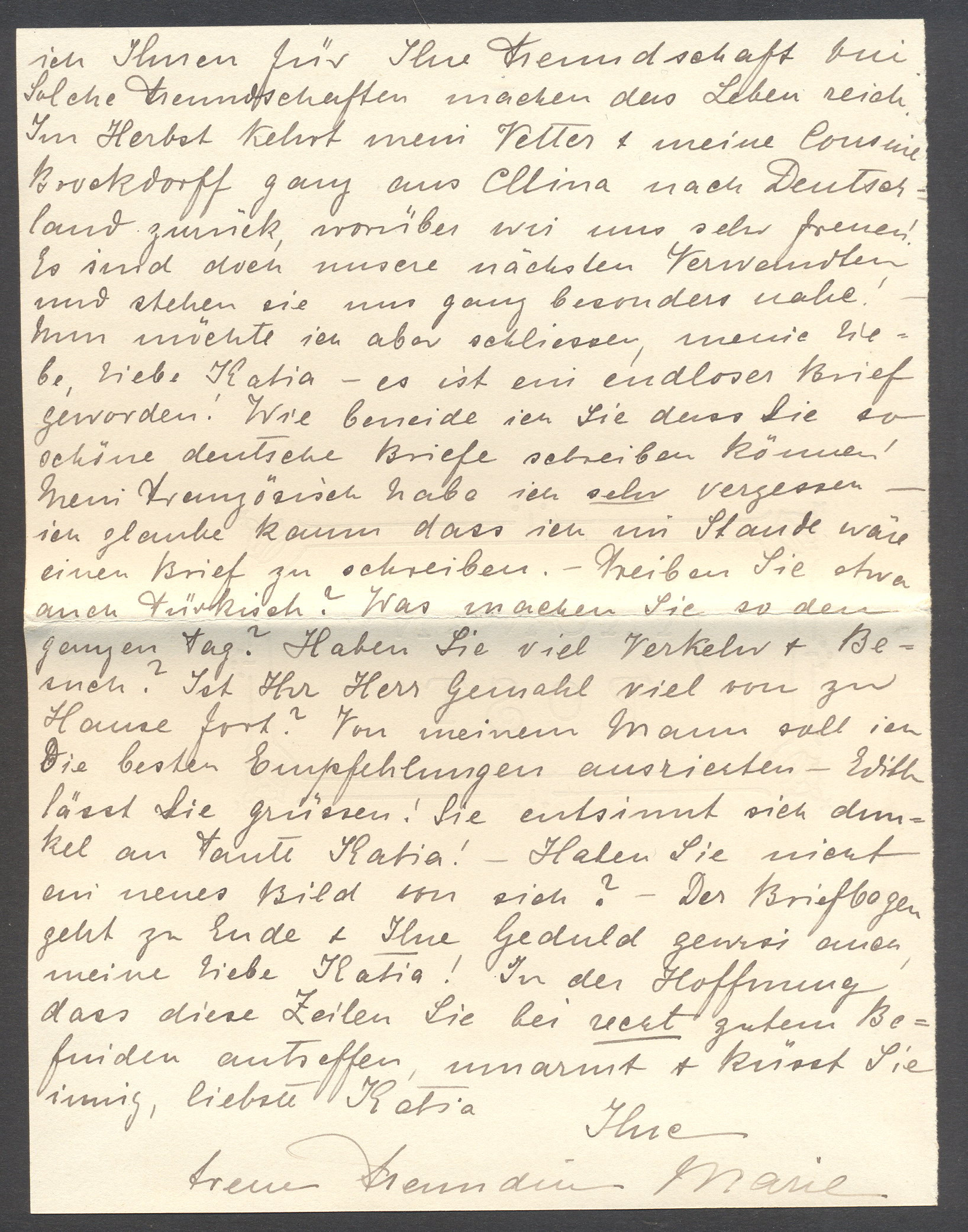ich Ihnen für Ihre Freundschaft bin. Solche Freundschaften mach das leben reich. Im Herbst kehrt mein Vetter & meine Cousine Brockdorff ganz aus China nach Deutschland zurück, worüber wir uns sehr freuen! Es sind doch unsere nächsten Verwandten und stehen sie uns ganz besonders nahe! - Nun möchte ich aber schliessen, meine Liebe, Liebe Katia - Es ist ein Endloser Brief geworden! Wie beneide ich Sie dass Sie so schöne deutsche Briefe schreiben können! Mein Französisch habe ich sehr vergessen - ich glaube kaum dass ich im Stande wäre einen Brief zu schreiben. - Schreiben Sie etwa auch türkisch? Was machen Sie so den ganzen Tag? Haben Sie viel Verkehr & Besuch? Ist Ihr Herr Gemahl viel von zu Hause fort? Von meinem Mann soll ich die besten Empfehlungen ausrichten - Edith lässt Sie grüssen! Sie entsinnt sich dunkel an Tante Katia! - Haben Sie nicht ein neues Bild von sich? - Der Briefbogen geht zu Ende & Ihre Geduld gewiss auch, meine Liebe Katia! In der Hoffnung dass diese Zeilen Sie bei recht gutem Befinden antreffen, umarmt & küsst Sie innig, liebste Katia