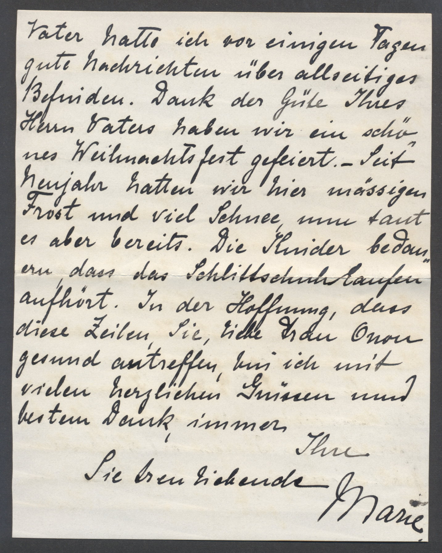 Durch Ihren Herrn Vater habe ich erfahren das mein Brief vom 12./25. December 14 glücklich in Ihre Hände gelangt ist. Inzwischen ist bei Ihnen eine kleine Nichte eingetroffen und möchte ich Sie bitten, Ihrem Herrn Bruder meine herzlichsten Glückwünsche zu übergeben. Hoffentlich geht es der jungen Mutter und dem Töchterchen gut. Von Ihrem Herrn Vater hatte ich vor einigen Tagen gute Nachrichten über allseitiges Befinden. Dank der Güte Ihres Herrn Vaters haben wir ein schönes Weihnachtsfest gefeiert. - Seit Neujahr hatten wir hier mässigen Frost und viel Schnee, nun taut es aber bereits . Die Kinder bedauern, dass Schlittschuhlaufen aufhört. In der Hoffnung, dass diese Zeilen Sie, liebe Frau Onou gesund antreffen, bin ich mit vielen herzlichen Grüssen und bestem Dank, immer