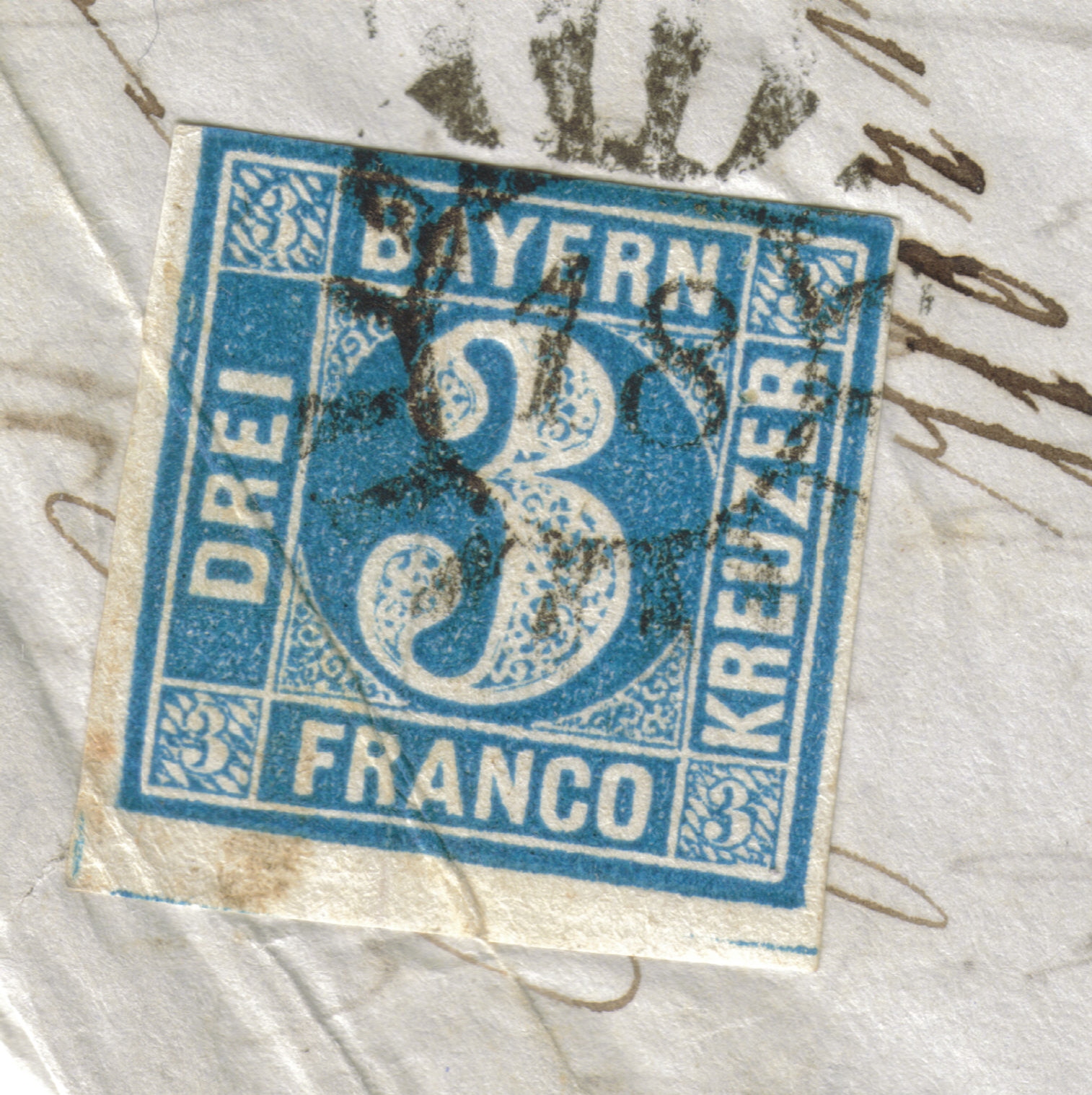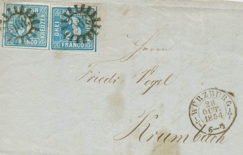 Hier ein Brief von Würzburg nach Krumbach. Wenn ich richtig sehe, muss das noch die Pl. 2 im Endstadium sein (dafür spricht das noch helle blau und die runden Ecken). Auch im Scan ist zu sehen, dass die rechte Marke ein etwas dunkleres blau hat (ich hoffe, dass hier nicht manipuliert wurde X(