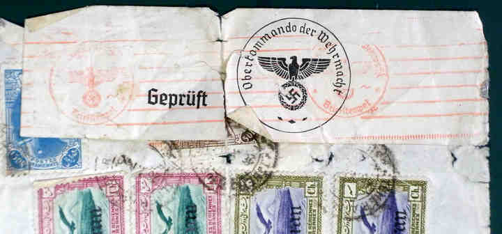 Die zwei Bilder mit den Zensurstreifen des OKW und dem Stempel aus dem Iran.
