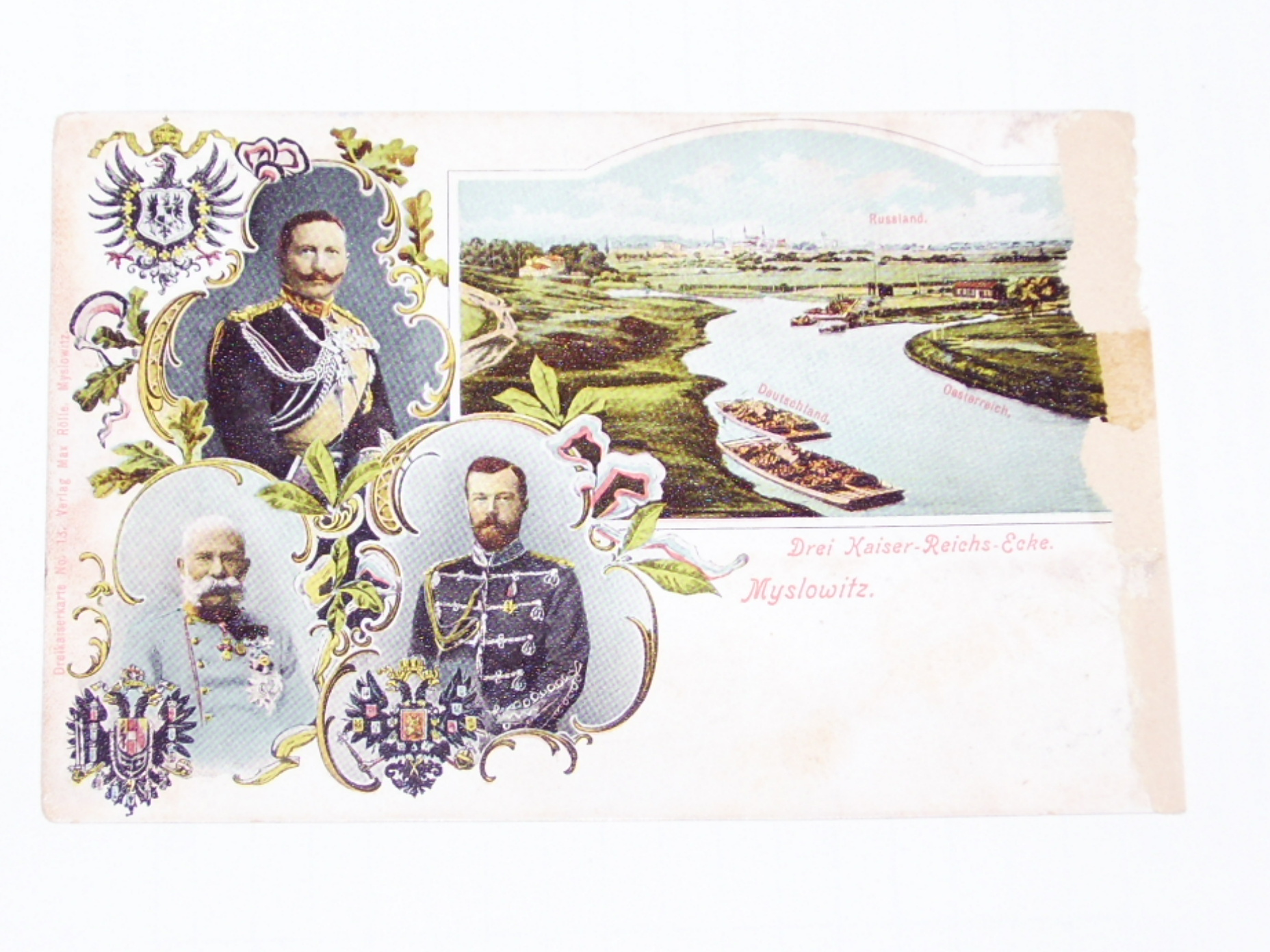Ich hab beim Renovieren eines Altbaus ein kleines Versteck gefunden. Neben ein paar Sachen aus der Vorkriegszeit, fand ich auch eine Postkarte aus dem Jahr 1906. Es zeigt als Motiv das 3 Kaiserreichs Eck bei Myslowitz, Schlesien (heute Polen), mit den Motiven der Kaiser aus Deutschland, Russland und Österreich - Ungarn. Auf der anderen Seite ist ein Gruß hinterlassen und aus jedem Kaiserreich eine Marke (gestempelt). Das zeigt was man alles beim Renovieren finden kann und das die Arbeit doch Spass machen kann.