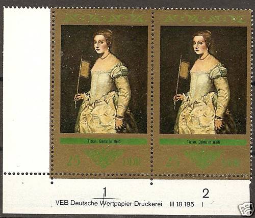 dann versuche ich es mal mit der Dame in Weiß von Tizian, philatelistisch verewigt per DDR 1895, hier aus einem aktuellen Angebot bei ebay sogar mit Druckvermerk!???