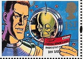 Auf einer früheren Marke ist übrigens Dan Dare, so heißt der Herr, noch besser als Raumfahrer zu erkennen. -