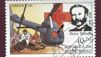 Ich suche eine Marke auf der der Begründer des Roten Kreuzes rechts oben in schwarz/weiß abgebildet ist.