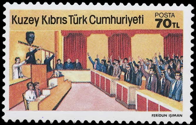 Es geht um einen politischen Konflikt, der seit Jahrzehnten trotz wiederholter Bemühungen (auch erst kürzlich) keine Lösung findet. Aus Aerger über die Behandlung dieser Frage im Parlament eines anderen Staates, hat der Ausgabestaat der gesuchten Marke eine verunstaltete Darstellung dieser Parlamentsdiskussion herausgegeben. Zeigt die Marke.
