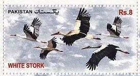Gesucht ist eine Marke, auf der gleich fünf fliegende Störche zu sehen sind. Das Herausgeberland liegt in Südasien.