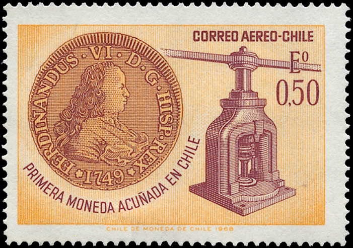 Ein Schiff verließ im Jahre 1752 Buenos Aires auf dem Weg zum spanischen Festland. Es war mit Gold- und Silbermünzen beladen. Es sank durch einen schweren Sturm, keiner überlebte. 1992 wurde das Wrack wiederentdeckt und der Schatz geborgen. Die abgebildete Goldmünze stammt aus diesem Fund. Sie wurde mal für ca. 3.300,- EUR im Handel angeboten. Gesucht wird eine südamerikanische Briefmarke, auf der diese Münze zu sehen ist (Teil eines Satzes). Auch in einem Block ist sie enthalten.