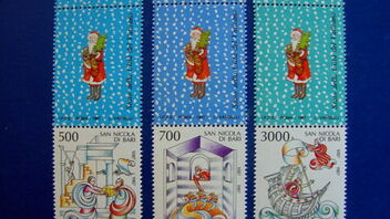 Dann suchen wir mal die älteste Darstellung auf einer Briefmarke mit einem Nikolaus oder Weihnachtsmann, auch Santa Claus genannt. Natürlich darf auch der Stammvater aller Nikoläuse, der erste echte Heilige Nikolaus, Bischof von Myra, gezeigt werden.