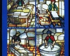 Die Papierherstellung auf bunten Fenstern ist hervorragend dargestellt in einem Block eines südeuropäischen Landes.