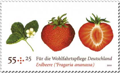 Da Erdbeeren auf fast allen Kontinenten wachsen, suchen wir eine Briefmarke mit anderthalb Erdbeeren aus dem pazifischen Gebiet.