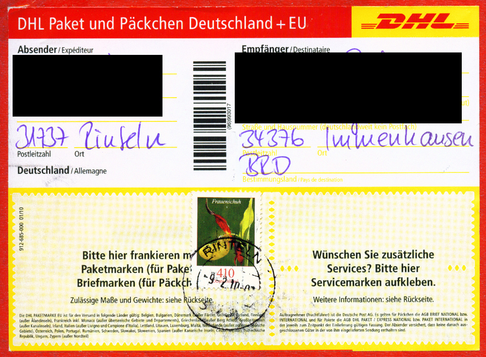 Mi.-Nr. 2768 4,10 Euro "Frauenschuh" auf Päckchenausschnitt (Tariferhöhung ab 01.01.2010)