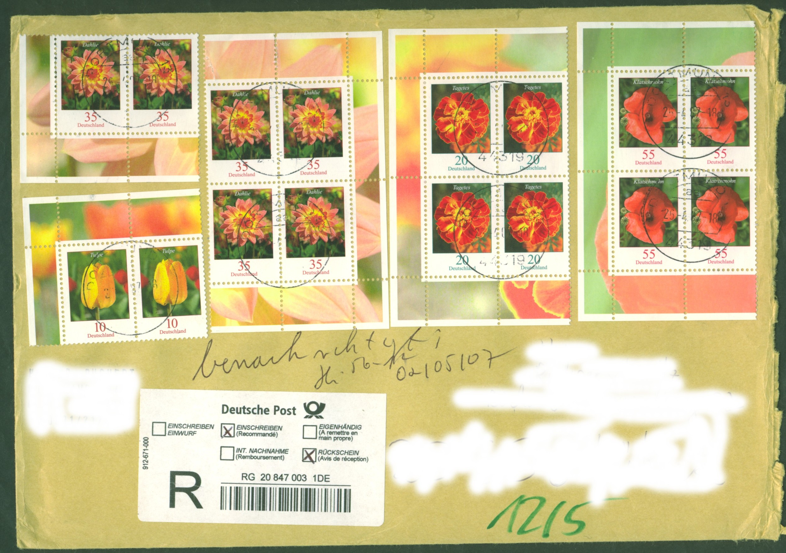 Ich hab einen Scan angehängt, der 6 Blumenmarken (5,10,20,50,65,70 Cent) auf einem Karton zeigt. (Uli hat diese Sendung an mich geschickt und frankiert).