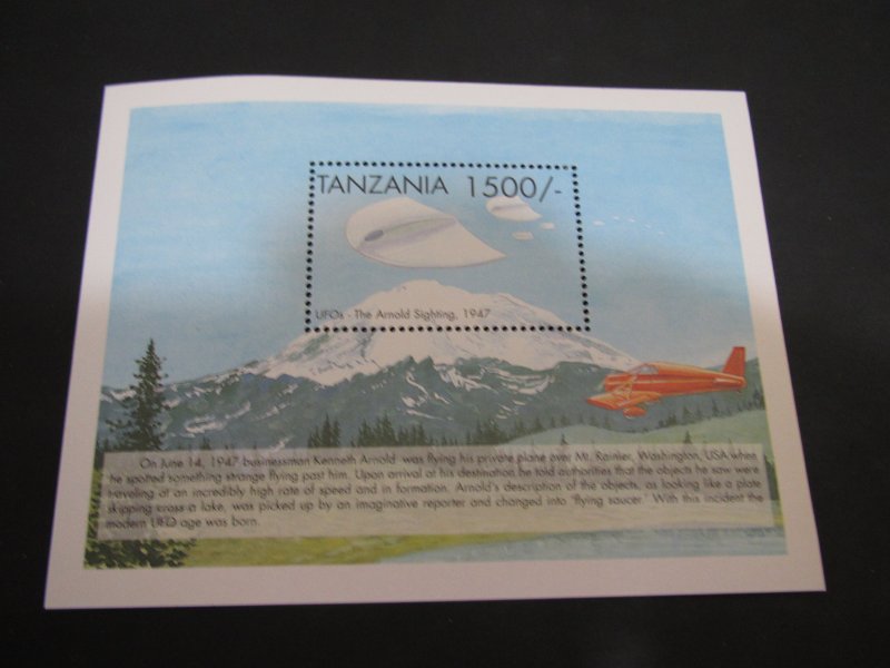 Tansania, ein ostafrikanischer Staat, hatte wohl noch nie Besuch von einem UFO. Deshalb informierte sich die Post dieses Landes über die weltweiten UFO-Sichtungen und verausgabte 1999 nicht weniger als 12 Marken in 2 Kleinbogen und 2 Blocks mit detailgetreuen UFOS. Nur die genauen Typenbezeichnungen (wie bei den Autos) und die Herkunftsplaneten fehlen auf den Marken. Katalogisiert unter der Michel-Nr. 3557-3568 12 Werte in 2 Kleinbögen, und Block 476-477 mit je einer Marke.