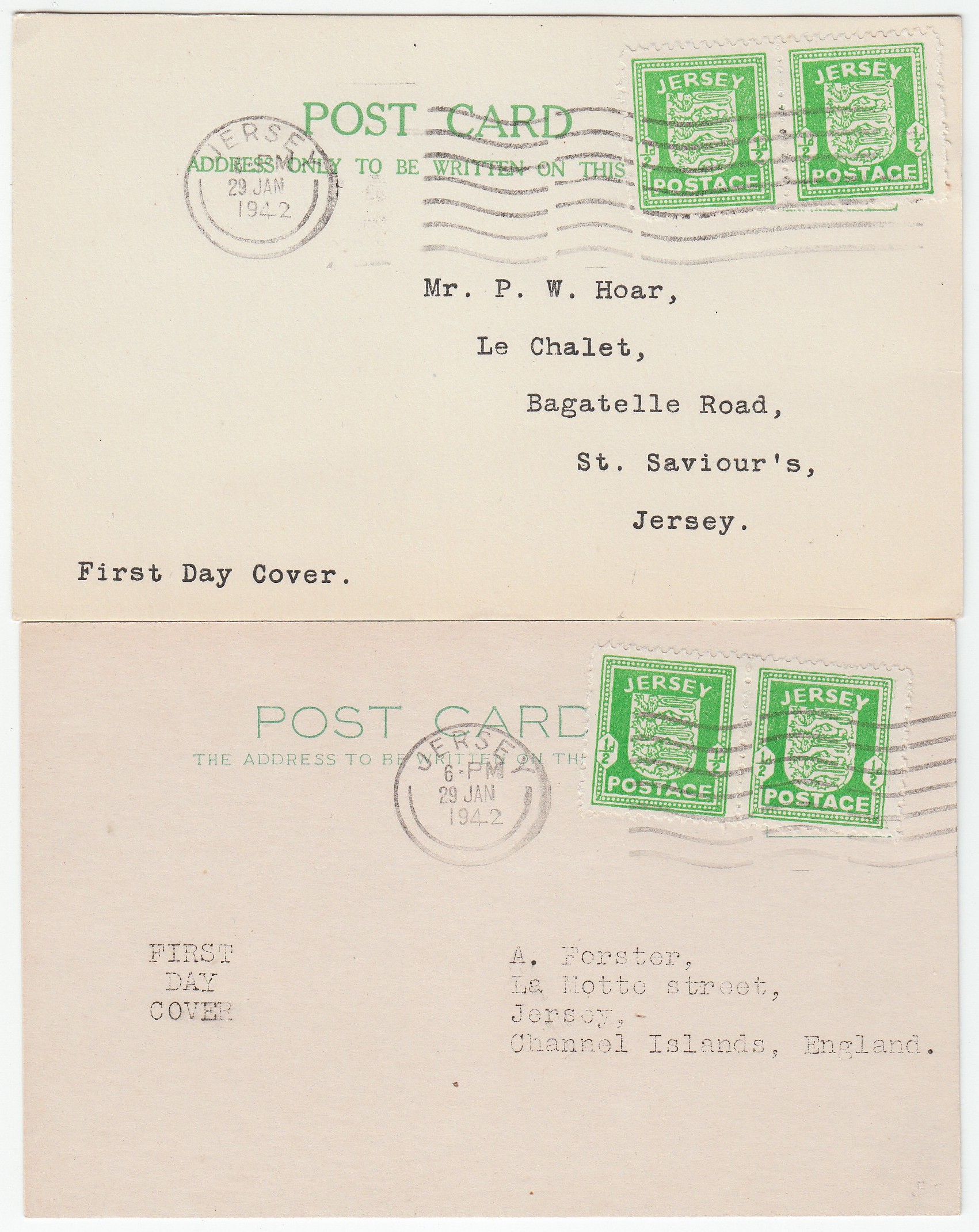 Hier die Michelnummer 1 y im waagerechten Paar echt gelaufen auf Drucksachen in Kartenform zum Inlandtarif von 1 p, entwertet am "29 JAN 1942", somit also als Erstagsbriefe wie in englisch vermerkt "First Day Cover".
