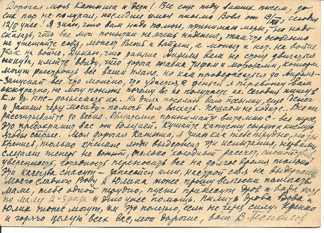 „L. N. Wir haben bereits einige Deiner Briefe erhalten und sind sehr froh, dass Du im Warmen bist und Dich gut ernährst. Wir sind alle gesund, wohnen zusammen, … Wir haben Dir nicht wenige Briefe geschrieben, es sollte sein, dass Du sie jetzt bereits erhalten hast. Wir denken häufig an Dich und hoffen, dass sich die Postverbindung einspielt. Wanja und Katja sind Mitglieder der Haus-Feuerwehreinheit: sie halten umschichtig Wache auf dem Dachboden zur Beobachtung des Feindes und können (gegen Bezahlung) im kaukasischen Restaurant das Mittagessen nutzen, was eine große [unleserlich] ist. Dein Geld (darunter die letzten 960 Rubel) haben wir erhalten und an Geld haben wir überhaupt keinen Mangel, denn beim Kartensystem sind die Ausgaben sehr begrenzt, woanders gibt es nichts zu kaufen. …“