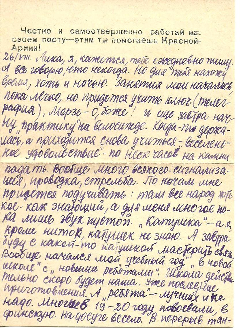 Der Eindruck auf dem Briefpapier lautet “Arbeite ehrlich und selbstlos auf deinem Posten, damit hilfst du der Roten Armee.“ Dieser Brief an eine Freundin in Kuibyschev (jetzt wieder Samara) wurde von einem jungen Mädchens, das eine Ausbildung in einem Fernmeldebataillon absolvierte, bereits am 26.08.1941 unter dem Eindruck der damaligen Lage der Stadt verfasst. Auf der einen Seite kommen in dem Brief der Drang und das Verantwortungsgefühl, nützlich sein und kämpfen zu wollen, sowie die Verachtung jener, die sich nicht ausreichend für die Verteidigung engagieren zu scheinen, zum Ausdruck. Andererseits schreibt sie offen von Furcht und von der Möglichkeit, schon bald [von dieser Welt] gehen zu müssen und von ihren praktischen Vorbereitungen (Vernichtung persönlicher Dinge) für diesen Fall. Der Brief wurde auf der Vorderseite in der rechten unteren Ecke von der Empfängerin nummeriert und als am Eingangstag beantwortet markiert.