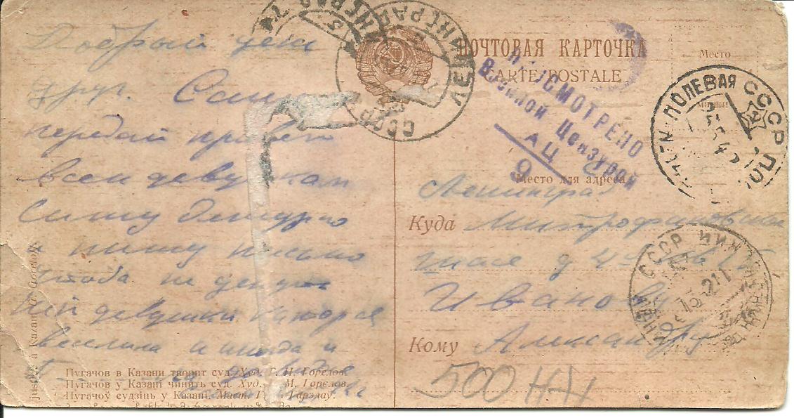 Die Karte mit dem Motiv des Bildes von G.N. Gorelow „Pugatschow hält Gericht in Kasan“ (gedruckt wahrscheinlich bereits in den 1930er Jahren) trägt leider keine Absenderangabe. Die Karte ist unten etwas verkürzt; es scheint aber, daß der fehlende Streifen bereits vor der Verwendung abgeschnitten wurde, denn der Mitteilungstext hört mit Unterschrift und Datum auf. Zudem ist die Nummer im Feldpoststempel nur unvollständig abgeschlagen, so daß beim Rückschluss auf die Einheit, der der Absender angehörte, nur gerätselt werden kann. Evtl. könnte die Nummer der Feldpoststation "145" (zur 85. Schützendivision) sein, obwohl eher eine Zahl mit rechtsseitiger Rundung, wie 3, 8, 9 zu vermuten wäre, aber die Einheiten mit diesen Nummern befanden sich zu jener Zeit weit von Leningrad entfernt. Die 85. SD dagegen gehörte zur Leningrader Front. Im Artikel von Jurij Pawlow „Potschta blokadnogo Leningrada“ in der Zeitschrift Filatelija Nr. 11/2011 ist eine Karte mit einem Stempel der Feldpoststation 145 abgebildet, der gewisse Ähnlichkeitsmerkmale aufweist.