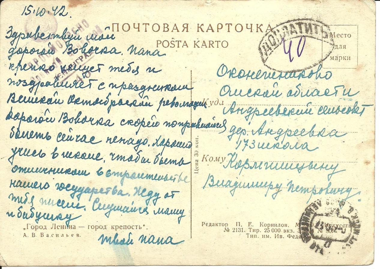 Ein Vater schreibt auf dieser Karte an seinen schulpflichtigen Sohn in der Siedlung Okoneschnikowo im Gebiet Omsk. Zwar gibt es keinen direkten Hinweis, dass der Sohn mit Mutter und Großmutter in diesen etwas abgelegenen Ort evakuiert wurde, aber es ist gut möglich, da aus Leningrad dorthin u.a. auch ein ganzes Waisenhaus umgesiedelt wurde ().