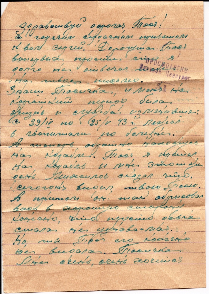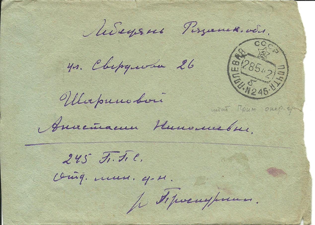 Der Absender der heute vorgestellten Sendung diente in einer Einheit der Leningrader Front. Die Postkarte wurde Ende Mai 1942 versandt und trägt einen entsprechenden Stempel des Zensors Nr. 9 der Militärpostbasis der 42. Armee der Leningrader Front mit den Buchstaben „AZ“ in der dritten Zeile. Die Karte war an einen Empfänger im Kirowskij Bezirk, einem Frontbezirk im Südwesten der Stadt, gerichtet.