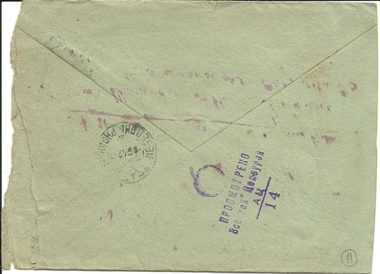 Der etwas unleserliche Aufgabestempel stammt von der Abteilung für Postbeförderung des Moskauer Bahnhofs. Hier wurde wohl auch der Nachgebührenstempel ohne Ortsangabe mit den handschriftlichen „40“ [Kopeken] beim leeren „Platz für die Marke“ wg. der fehlenden Frankatur aufgebracht. Der Zensurstempel zeigt den Ort der Zensur (Leningrad) in Klarschrift. Leider gibt es keinen Ankunftstempel. Es scheint aber, dass der Absender eine gewisse Erfahrung mit den Postlaufzeiten hatte, denn er gratuliert bereits am 15.10. zum „Fest der Großen Oktoberrevolution“, das am 7. November begangen wurde. Passend zum Feiertag schreibt er „Lerne gut in der Schule, um ein Musterschüler beim Aufbau unseres Staates zu sein.“ Aber neben diesen politischen, wohl auch ernst gemeinten Worten spricht ansonsten aus dem Text väterliche Liebe und Sorge.