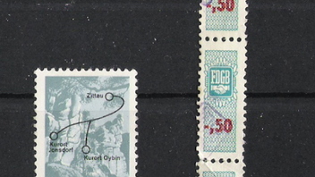 Bei den Zweiten Marken, also dem dreierbogen sind wenigsten ein paar Angaben. Zu sehen ist ein Logo, mit den Buchstaben FDGB und zwei Hände die sich greifen. Wertangabe -,50 (was auch immer für eine Währung)