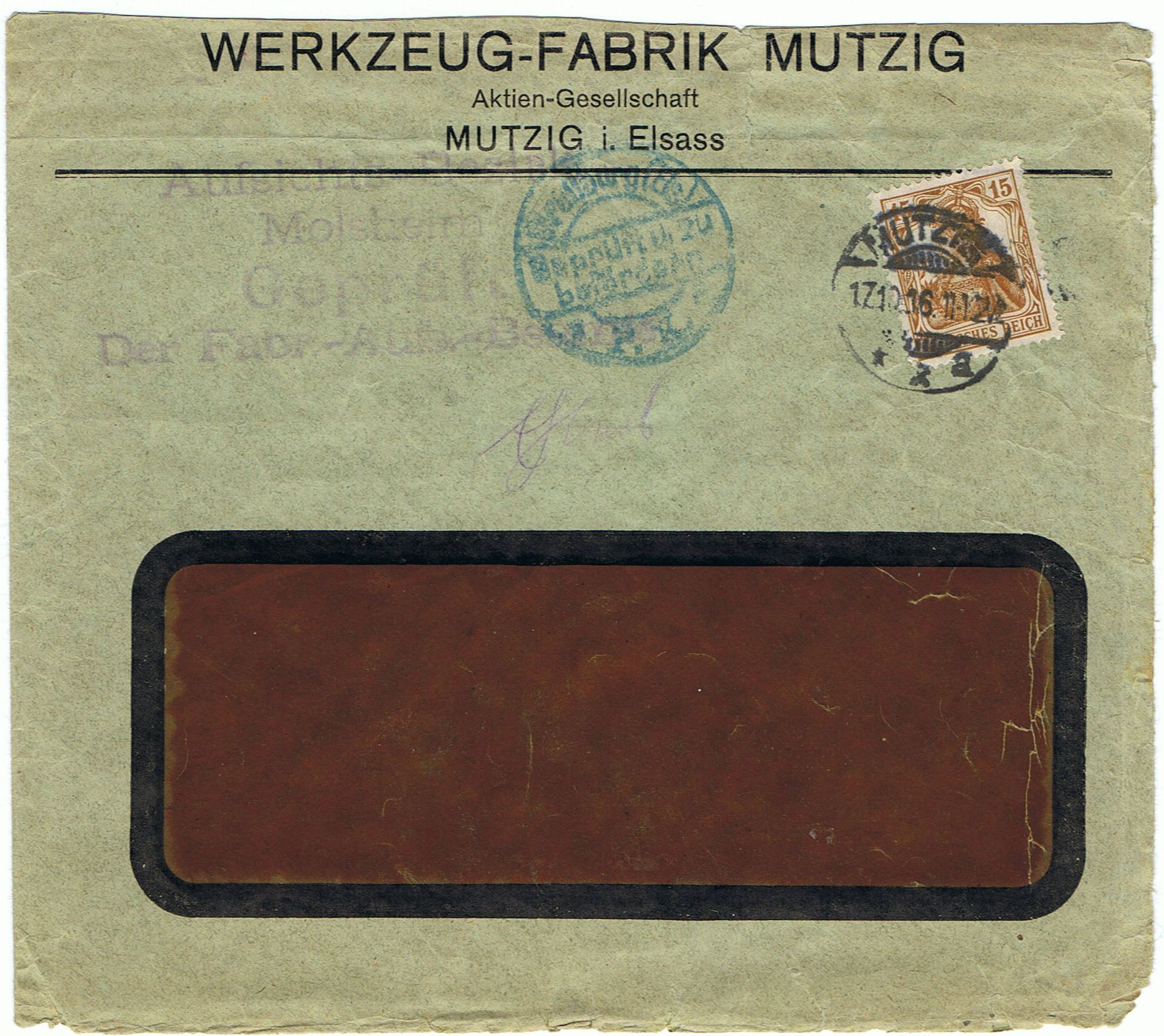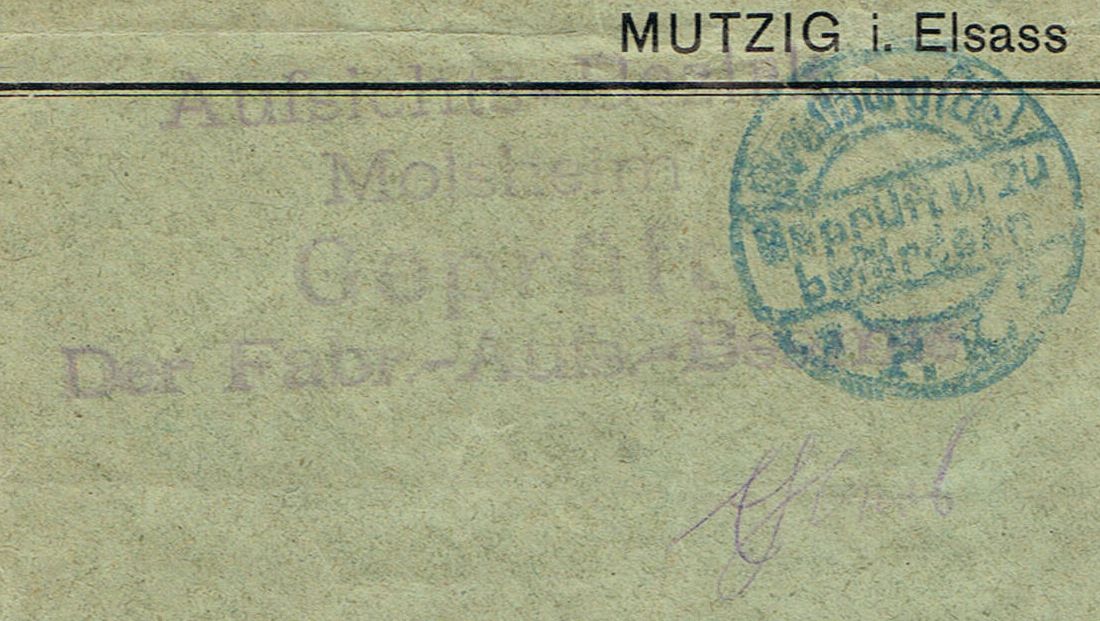 ich zeige einen Brief aus Mutzig im Elsass von 1916 mit "üblichem" Zensurstempel von Straßburg und einem etwas undeutlichen 4 Zeiler: