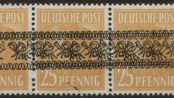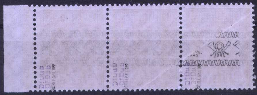 Dem freundlichen Hinweis von -steppenwolf habe ich freudig erregt diese Neuerwerbung zu verdanken: Dreierstreifen der MiNr 45I mit Doppelaufdruck sowie rückseitigem Teilabklatsch, hervorgerufen durch seinerzeitigen Bogenumschlag nach dem ersten Aufdruckvorgang!