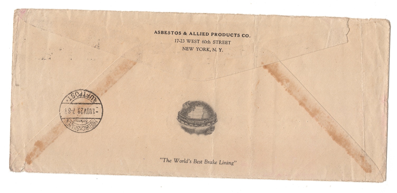 Für die Rückfahrt von Lakehurst nach Friedrichshafen (A: 29.10. 7:55 Uhr, L: 1.11. 7:06 Uhr) wurden 51.938 Karten und 49.745 Briefe befördert. Das Luftschiff-Porto für diese Post betrug 1 Dollar für Briefe, 50 cent für Karten. Hinzu kam das inneramerikanische Porto zur Beförderung nach Lakehurst (Briefporto 5 cent) – Deine Belege sind beide portorichtig.