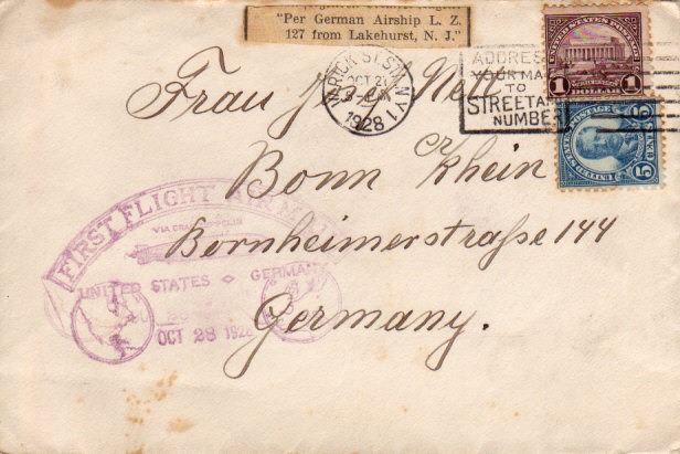 Auf der Hinfahrt von Friedrichshafen nach Lakehurst (Aufstieg 11.10. 7:54 Uhr, Landung 15.10. 23:38 Uhr) wurden insgesamt 37.590 Postkarten und 28.124 Briefe befördert. Postsendungen, die für diese Fahrt bestimmt waren, mussten im geschlossenen Umschlag an das Postamt in Friedrichshafen geschickt werden. Dort wurde die Frankatur gestempelt (Postkarten 2 RM, Briefe 4 RM) und der ovale Bestätigungsstempel (bei Deinem Brief in blau, aber auch in violett, grün oder rot) abgeschlagen.