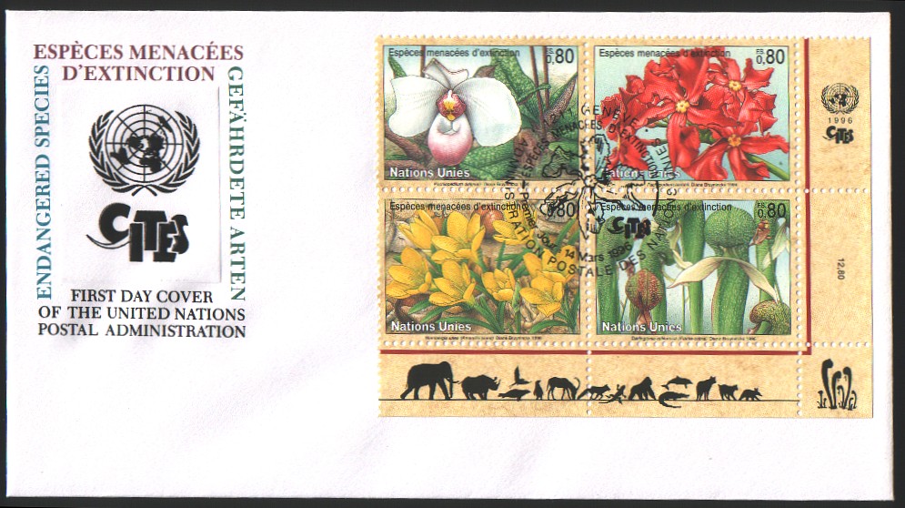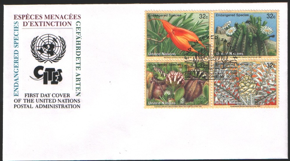 Bilder: Einzelmarken und offizieller Ersttagsbrief (FDC) mit Sonderstempel einer Kannenpflanze.