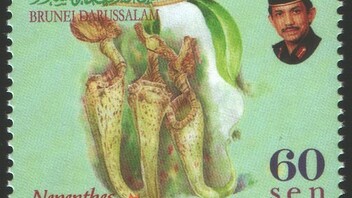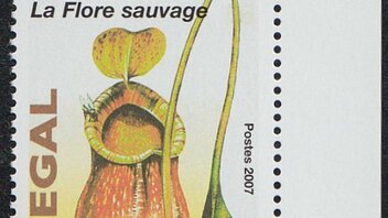 Auf der rechten Marke über das Wertzeichen des Zusammendruckes ist eine Kannenpflanze Nepenthes abgebildet. Es könnte sich entweder um eine Nepenthes alata oder eine Nepenthes mirabilis handeln. Auch hier sieht man dass die Kannenpflanzen in den tropischen Raum sehr verbreitet sind.