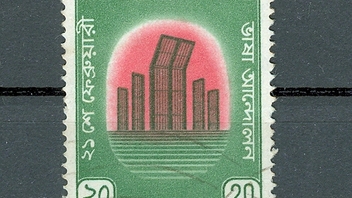 Die Marke stammt aus Bangladesh, Darstellung zeigt das Shaheed Minar, Märtyrer-Denkmal in der Nähe Dhaka Medical College. Erinnert an die durch die Polizei getöteten Studenten ab 1948, bis 1956 endlich Bengali als zweite Amtssprache in Pakistan zugelassen wurde.