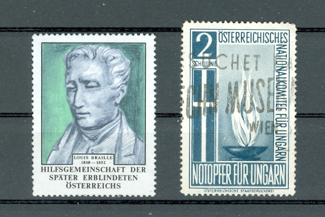 Briefmarke handelt. Die Hilfsgemeinschaft hat sie 1966 von der Wiener Druckerei Brüder Rosenbaum herstellen lassen. Die Druckerei Brüder Rosenbaum hat aber auch im Auftrag der Österr. Post offizielle Briefmarken gedruckt. Die Louis-Braille-Verschlußmarke wurde in Bogen a 10 Stück an Spender verschickt. Einmal um auf das großartige Werk von Louis Braille aufmerksam zu machen, andererseits um damit auch Spenden für unsere Aufgaben zu lukrieren. Den damals beigelegten Folder finden Sie im Anhang. Auch die andere „Marke“ ist keine Briefmarke. Ich weiß aber nicht, wer sie und wann herausgegeben hat. Anhand des Aufdruckes „2 Schilling“ kann man aber annehmen, dass es sich um eine Wohltätigkeitsmarke für die Ungarnhilfe (1957?) gehandelt hat. Die Briefmarke dürfte wohl irrtümlich mit einem Poststempel versehen worden sein.