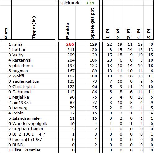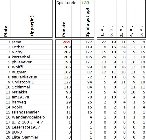 Hier mal wieder eine aktuelle Wertung - und ich darf gleich 2 neue Mitlglieder BUND und Elite-Sammler der Raterunden begrüßen in der Hoffnung dass dies schon die Erweiterung der Tipprunde für 2023 ist ;)