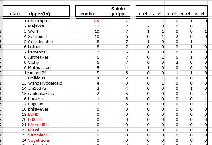 Trotz des enormen Zuspruchs in diesem Jahr vermisse ich noch ein paar Vorjahrestipper und würde mich freuen, euch wiederzusehen. Ich habe die mal farblich markiert.