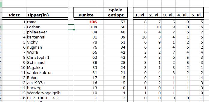 warten wir mal auf die offizielle Tabelle von Wolffi - ist schon wieder gut 8 Spiele her :)