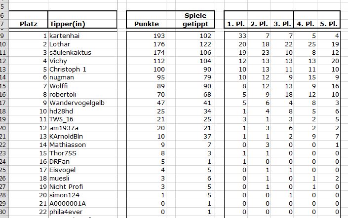 Hier die Auswertung aktuell nach dem 129. Spieltag. Platz 2 und 3 sind nicht entscheiden. Da geht noch was...