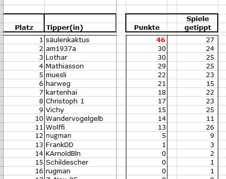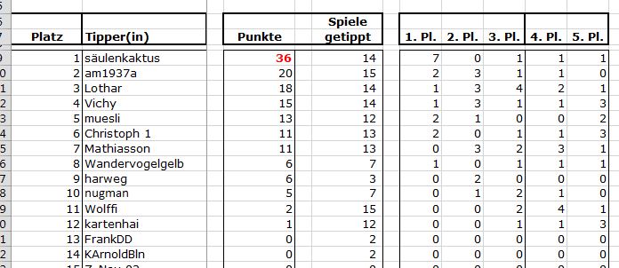 Ganz bemerkenswert finde ich unseren Heinrich (am1937a), der fern ab jeden taktischen Tippen sehr, sehr früh immer seine Tipps abgibt und trotzdem auf Schlagdistanz zum Podiumsplatz ist.