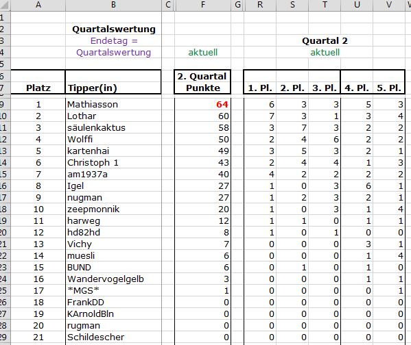 Zur Erinnernung: in der Quartalsauswertung werden die Punktzalhen der ersten fünf Plätze gewertet.