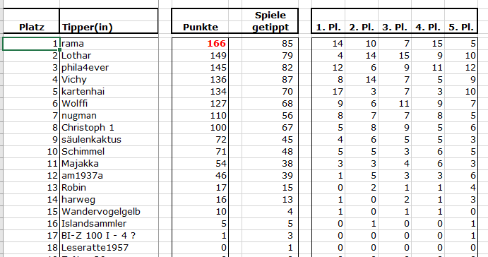 Wolffi, irgendwas stimmt hier nicht - und zwar hat m.E. kartenhai einen Pkt zu wenig in deiner Tabelle (132 statt 133) - wir hatten ja im Spiel 89 mal wieder eine Doppelbelegung Platz 3 - aber kartenhai hat wohl nur 2 Pkt bekommen statt 3 ... kannst Du das mal prüfen bei Gelegenheit?