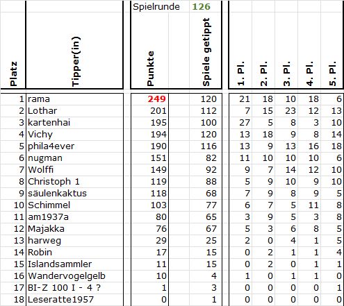 Hier wieder die Tabelle - mittlerweile hat Lothar mir den dritten Platz stibitzt - der bessere gewinnt - so ist es nun mal ;)