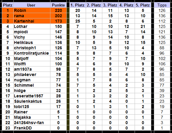 an Lothar mit dem zuletzt erreichten 5. Platz hast du einen Rekord aufgestellt. Bisher hatte ich gemeinsam mit dir 20* innerhalb eines Spieljahres den 5. Platz inne gehabt. Jetzt hast du dich mit 21 fünften den absoluten Rekord geholt. Glückwunsch- und du kannst ja noch ausbauen!