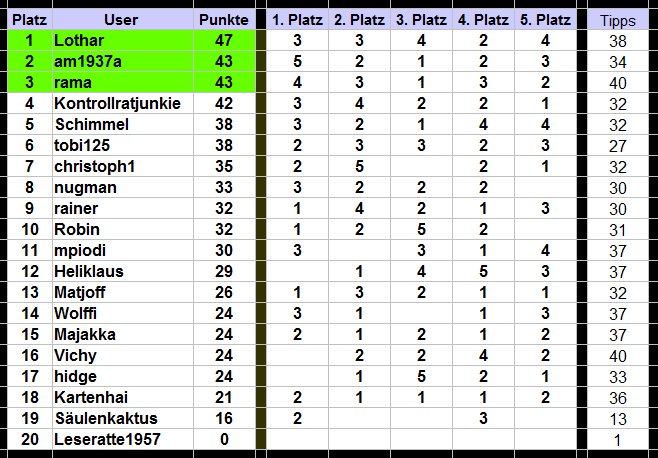 Hallo, fünf weitere Spielrunden sind seit der letzten Tabelle beendet worden. Damit ist es Zeit für eine neue Tabelle. Stand bis einschließlich Spiel 45 =