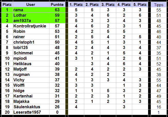 Gewinner der letzten 5 Spiele ist User Robin, der immerhin 16 von möglichen 25 Punkten holte und sich damit an die Spitze gesetzt hat. Der vierte Platz ist ebenso hart umkämpft und wird von drei punktgleichen Usern @am1937a Kontrollratjunkie und Rainer beansprucht. Auch in den hinteren Positionen ist ein ständiger Wechsel zu bemerken.